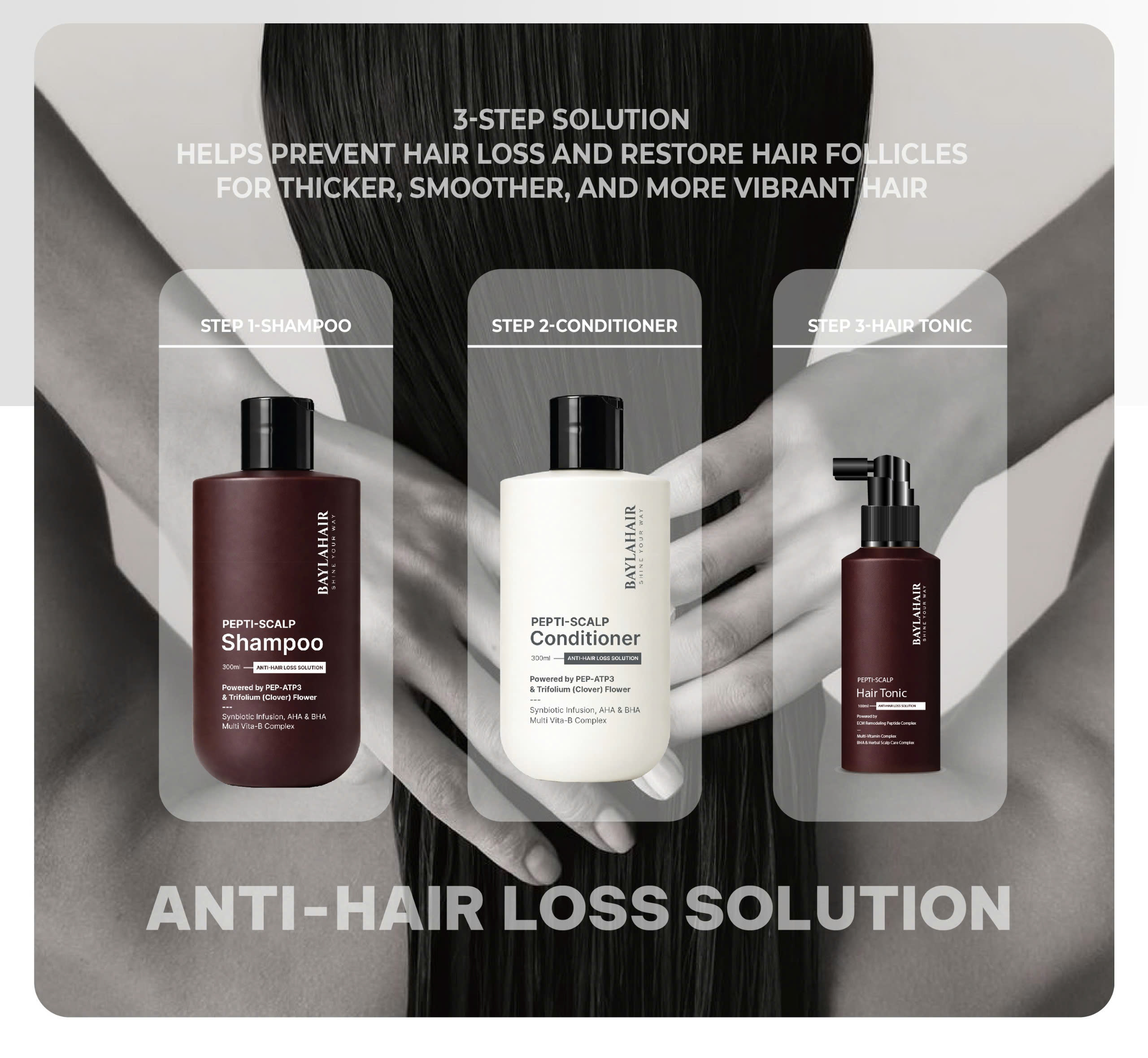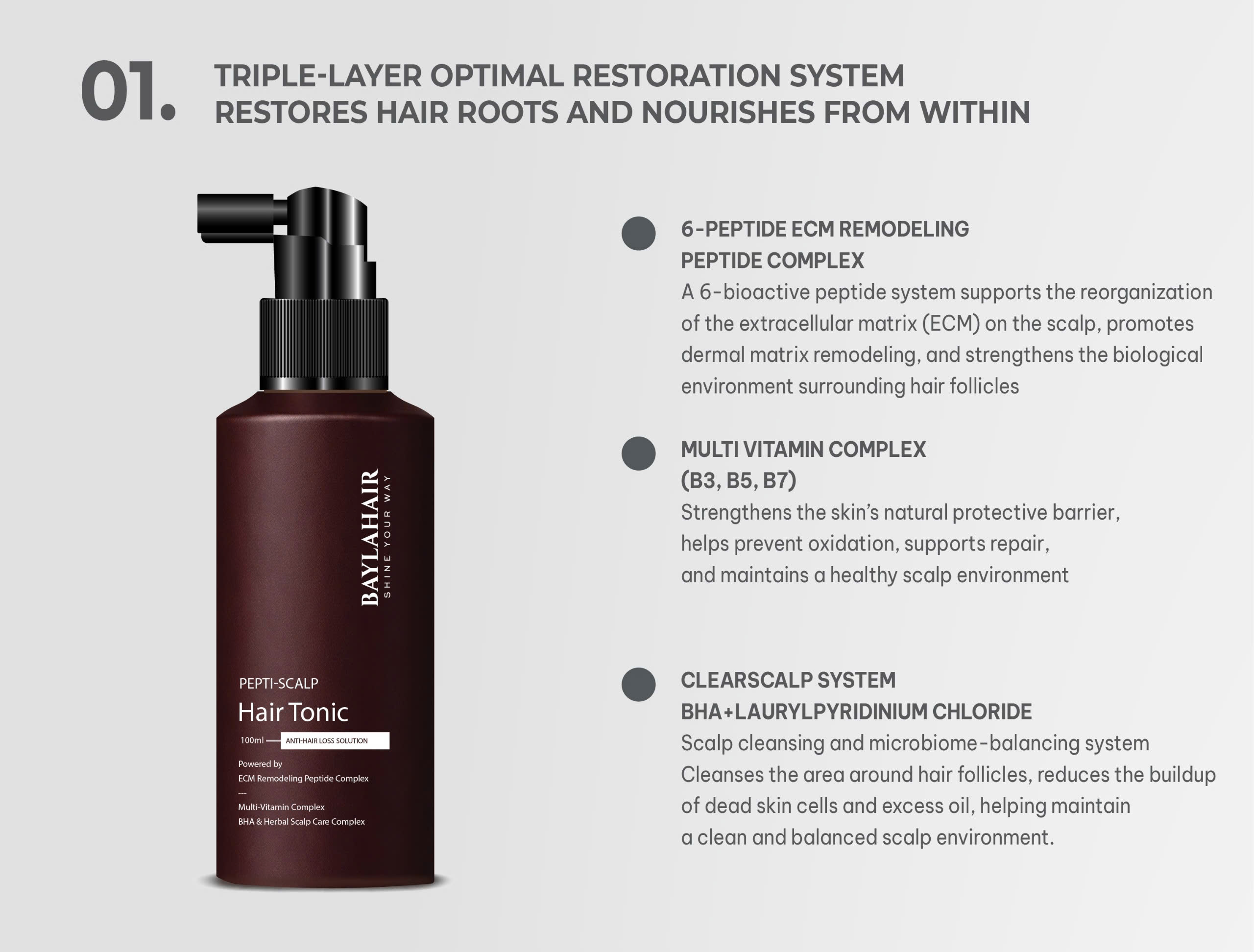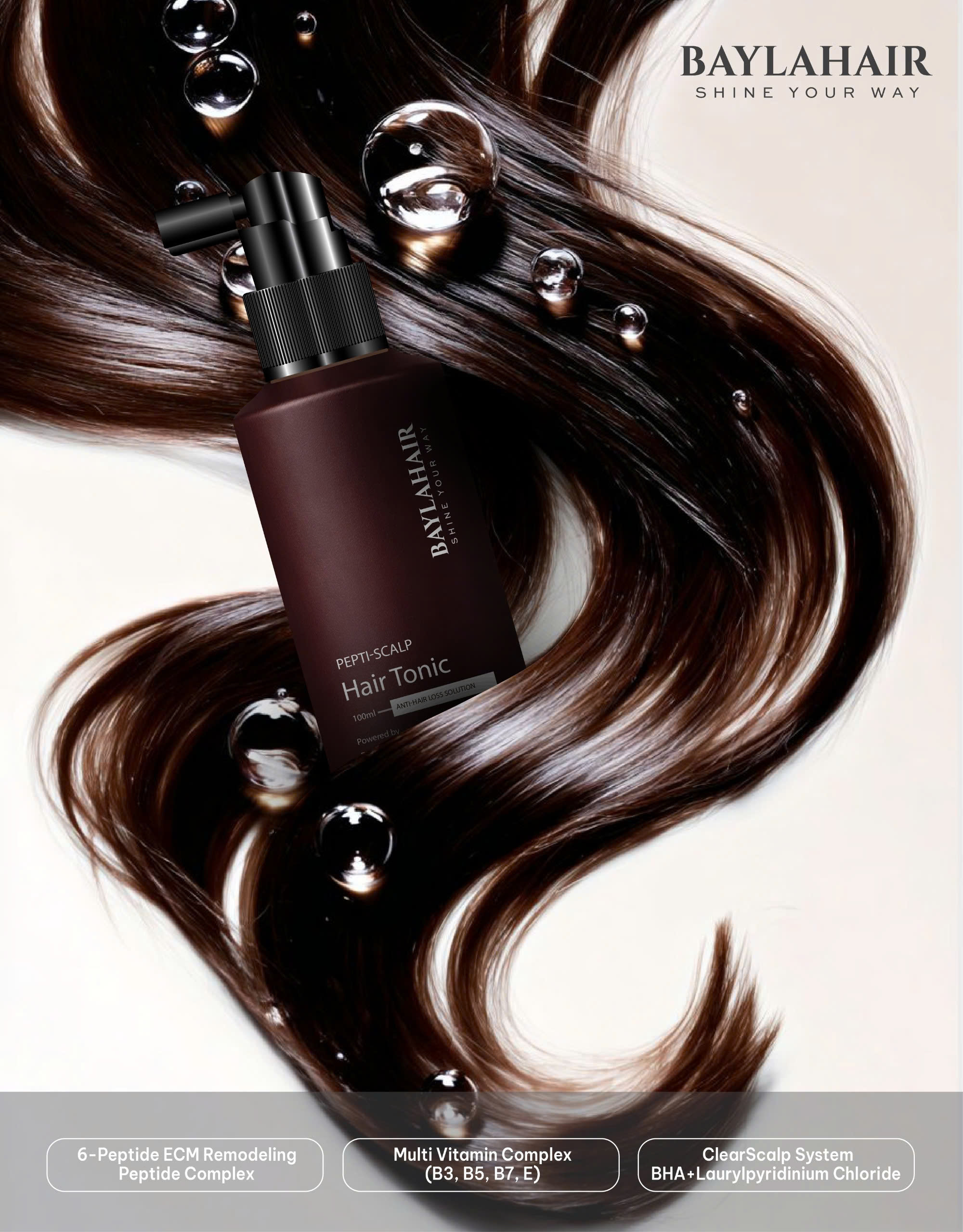 BAYLAHAIR Pepti-Scalp Hair Tonic – Step 3 of the ANTI-HAIR LOSS line – is a nourishing mist featuring the 6-peptide ECM Remodeling Peptide Complex and multi-vitamins to strengthen hair roots, reduce dandruff, support anti-folliculitis, decrease dead skin cell buildup and excess oil, and prevent hair loss.