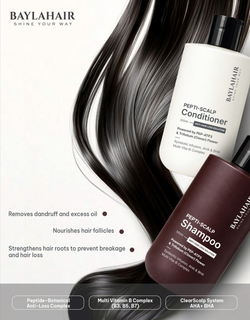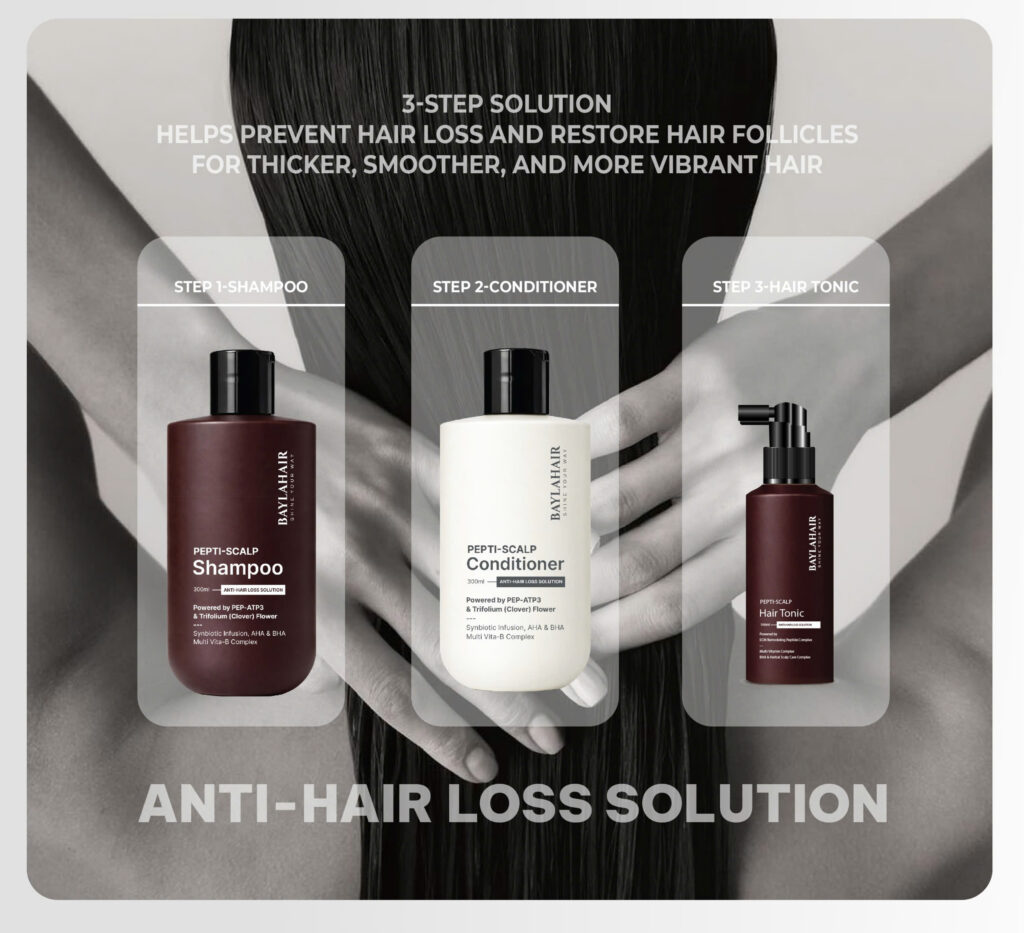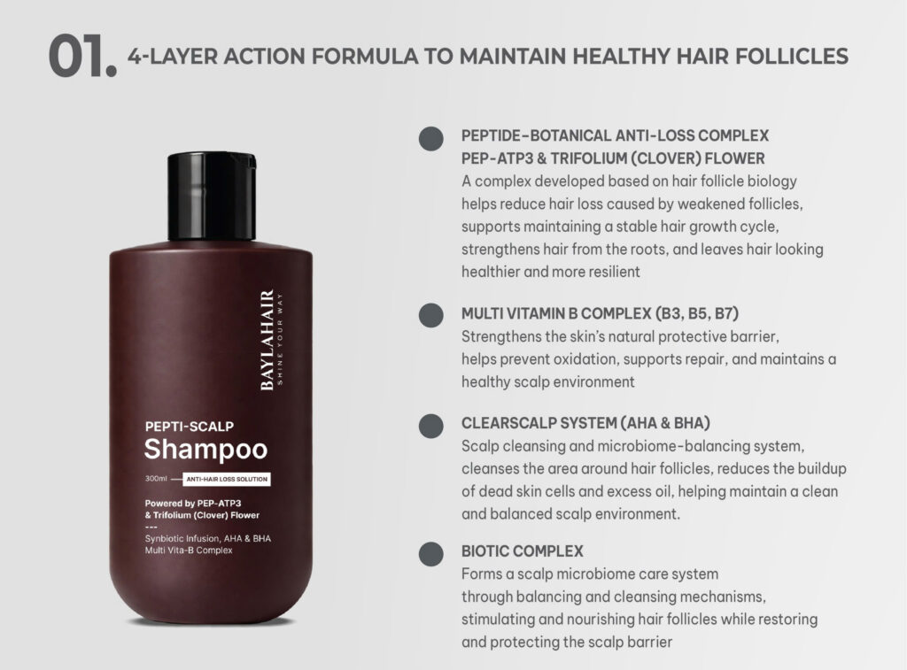 BAYLAHAIR Pepti-Scalp Shampoo – Step 1 of the ANTI-HAIR LOSS line – is a multi-action cleansing shampoo: anti-dandruff, excess oil control, and scalp exfoliation. This shampoo acts as a primer for the scalp, ensuring follicles are clear and ready to absorb active ingredients.