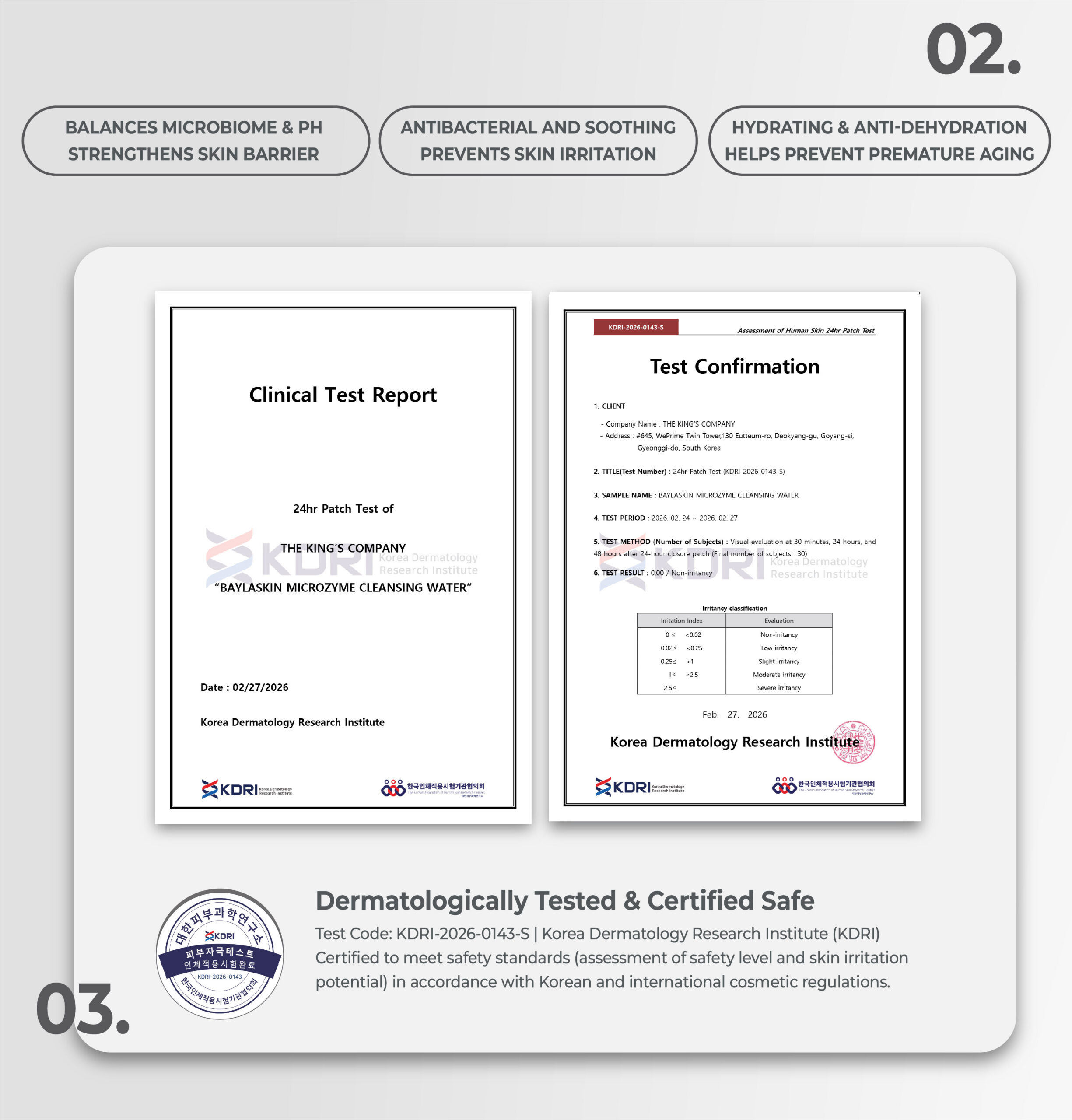 Microzyme Cleansing Water applies bio-enzyme technology to deeply cleanse makeup, dirt, and sebum on the skin surface, while supporting the restoration of the natural microbiome.