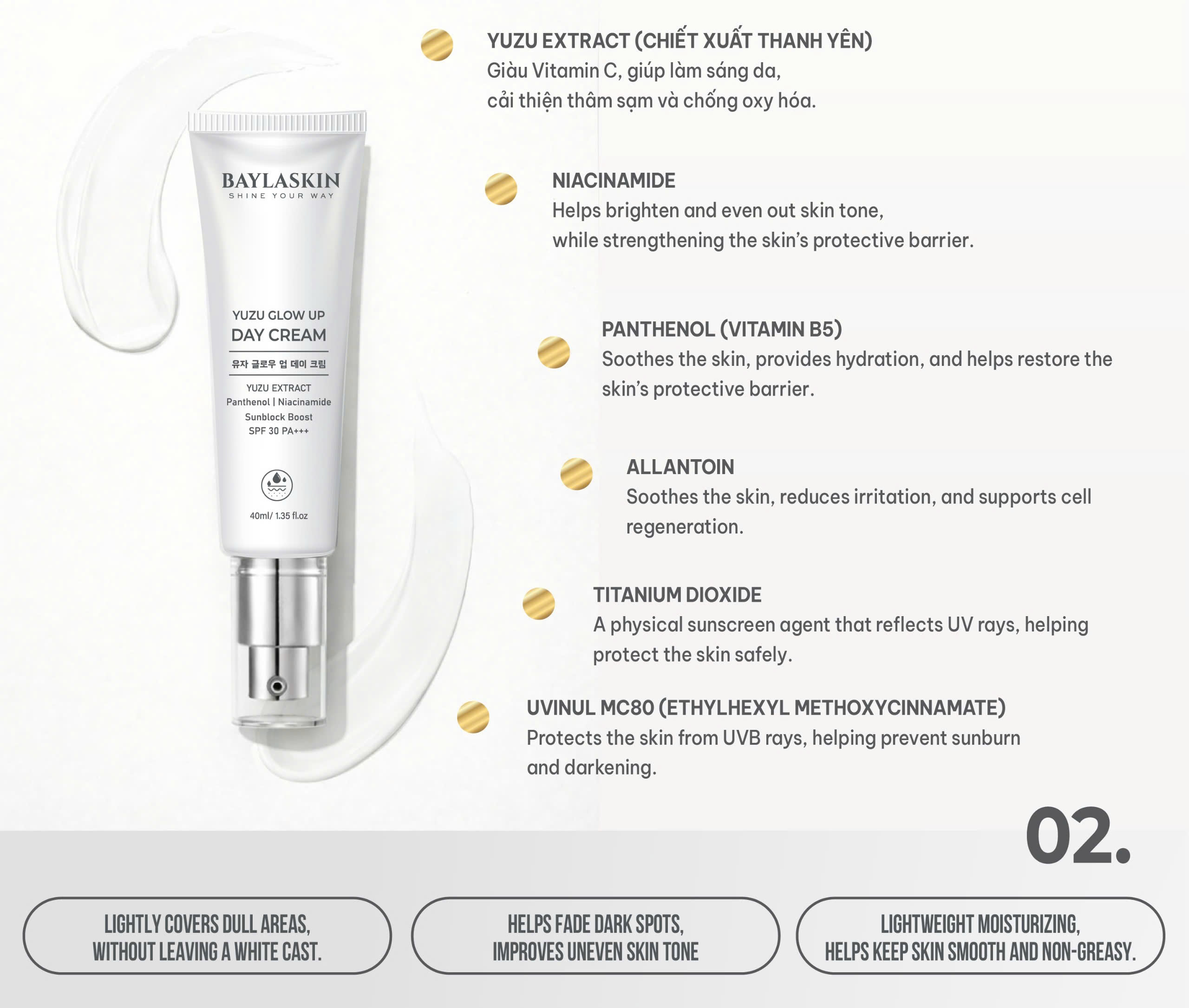 The formula contains Yuzu extract rich in Vitamin C, combined with Niacinamide and Panthenol to help even out skin tone and improve dark spots, while strengthening the skin barrier against the harmful effects of UV rays and the environment. The lightweight cream texture absorbs quickly without stickiness or heaviness, making it suitable for daily use on all skin types, including sensitive skin.
